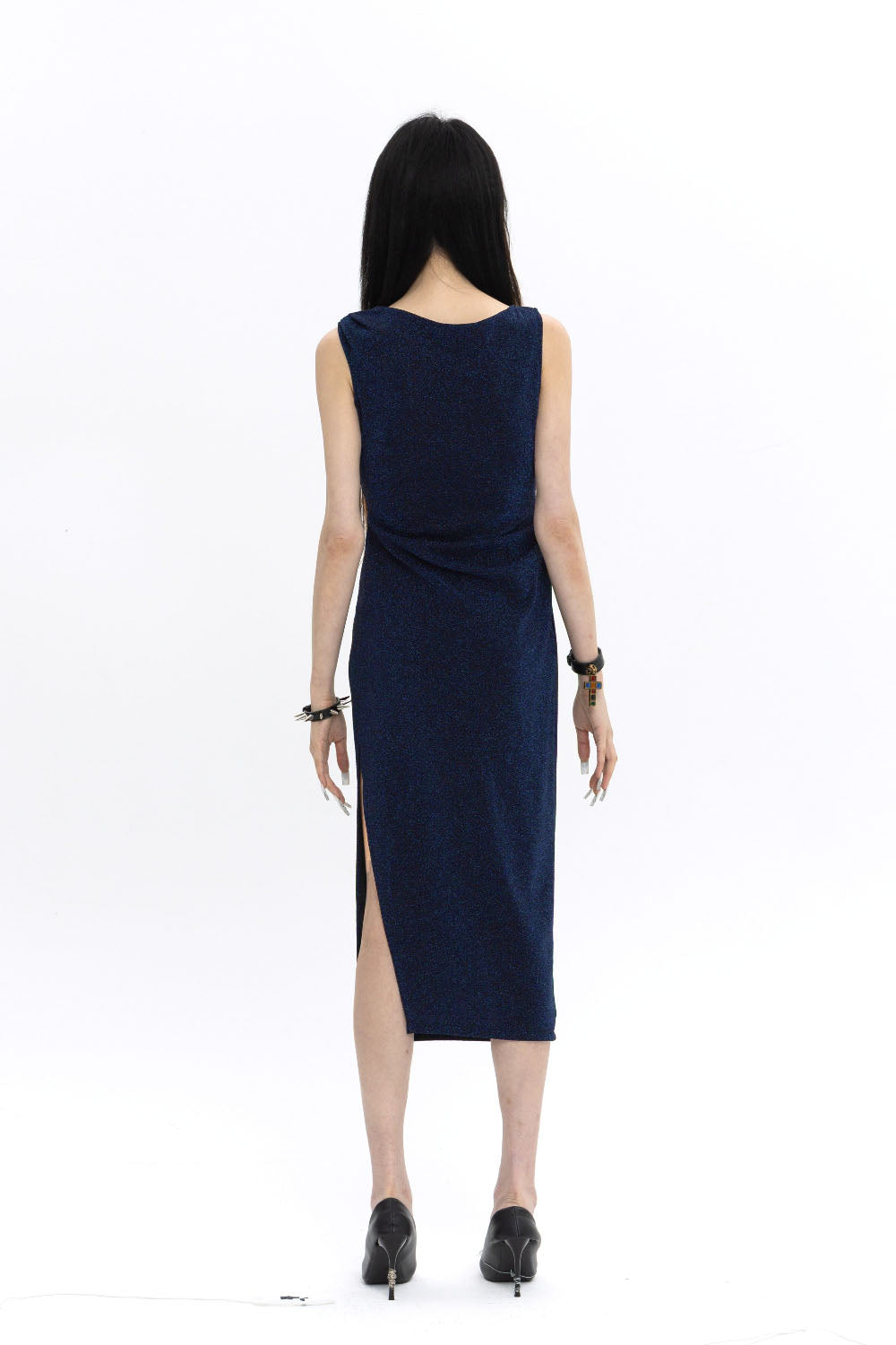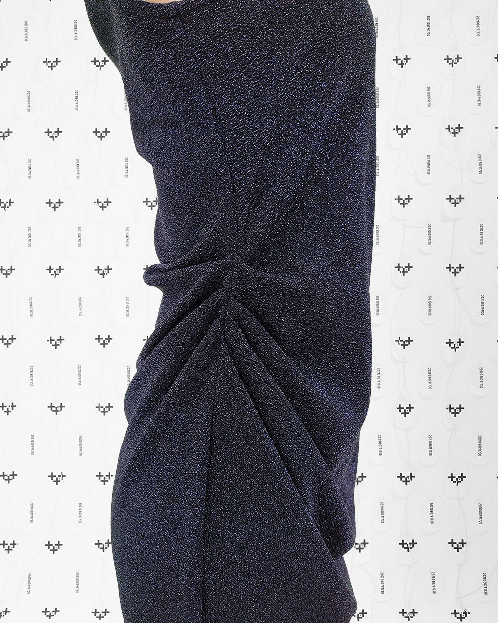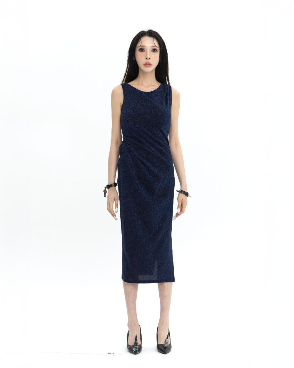 메탈릭한 펄감이 있는 원단은 신축성이 뛰어난 소재로 어느 방향으로도 늘어나서 움직임이 편안해서 데일리로 입기에도 부담스럽지 않고 구김이 잘 가지 않는 점이 매력입니다. 사진에서 잘 표현 되지 않지만 실제로 보면 메탈릭한 소재가 주름을 더욱 강조해 주는 매력이 있는 드레스 입니다.