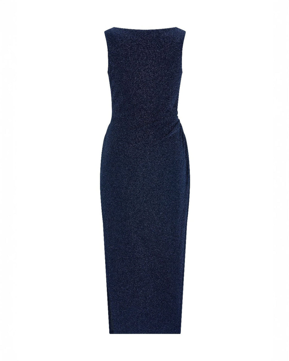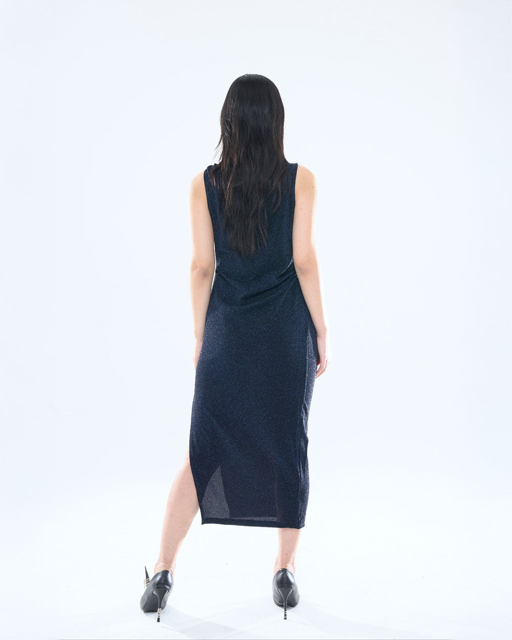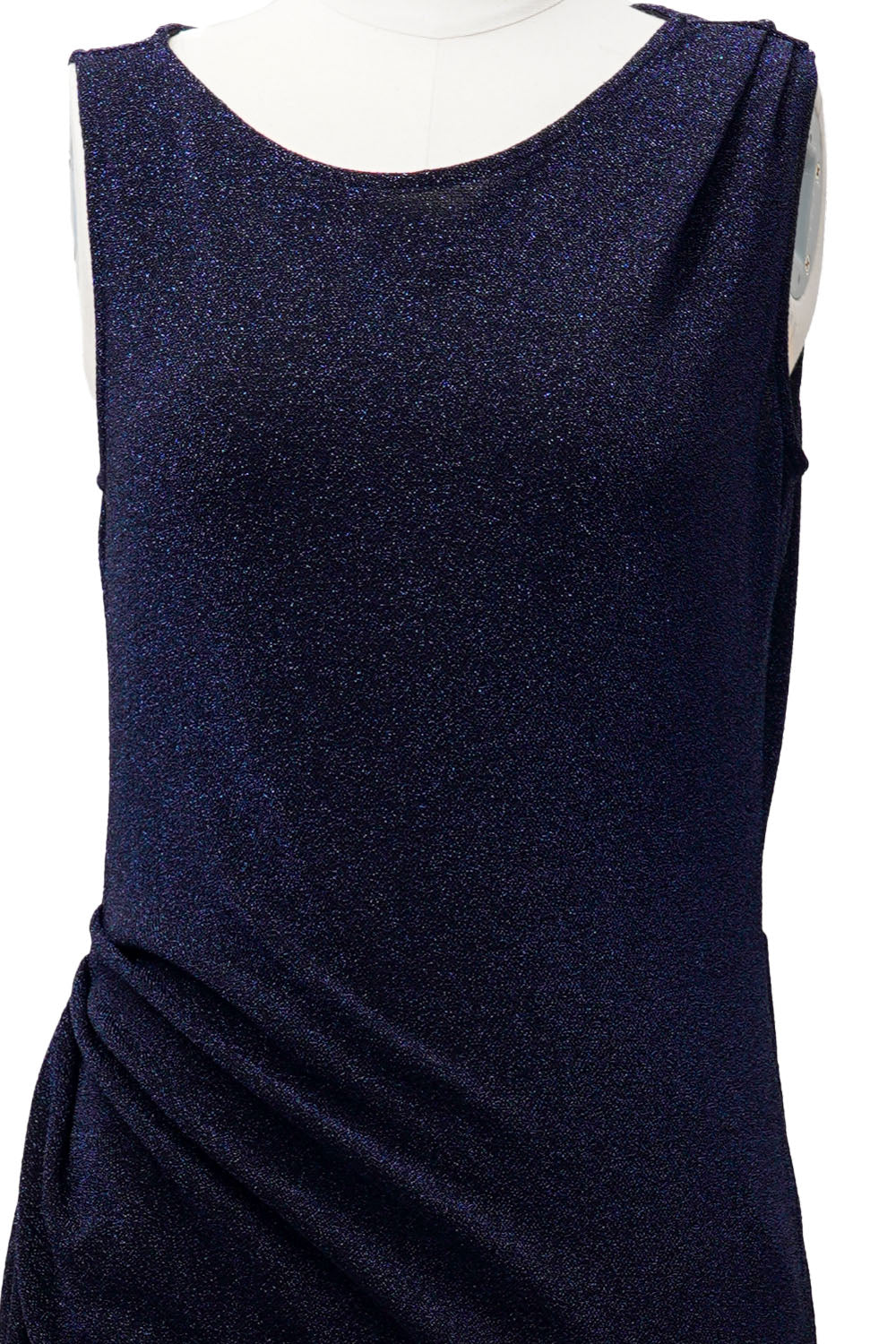 메탈릭한 펄감이 있는 원단은 신축성이 뛰어난 소재로 어느 방향으로도 늘어나서 움직임이 편안해서 데일리로 입기에도 부담스럽지 않고 구김이 잘 가지 않는 점이 매력입니다. 사진에서 잘 표현 되지 않지만 실제로 보면 메탈릭한 소재가 주름을 더욱 강조해 주는 매력이 있는 드레스 입니다.