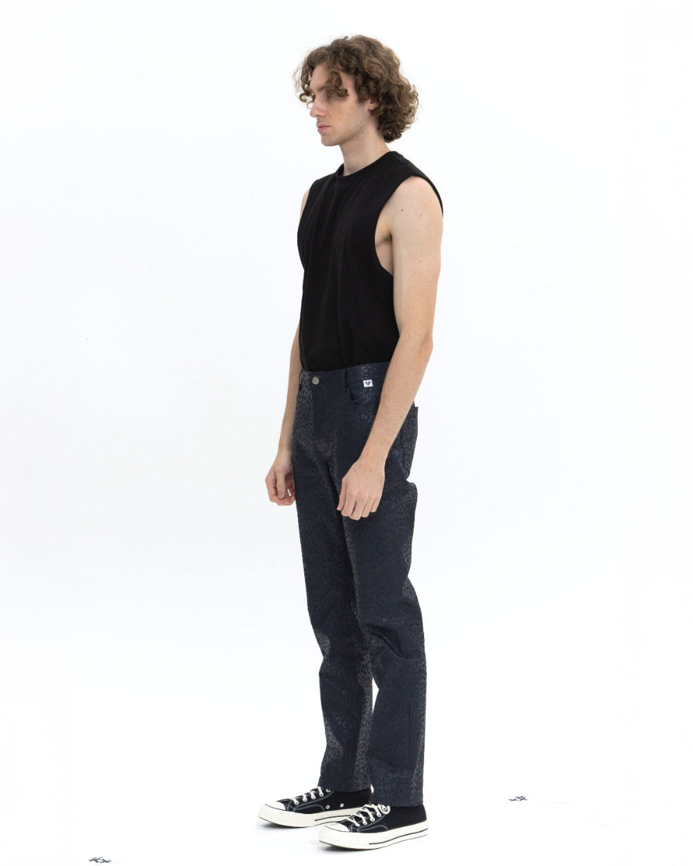 신축성있는 소재로 편안한 움직임이 가능한 스키니에 가까운 슬림스트레이트 팬츠 입니다. 은은한 레오파드 패턴이 매력지고 진청 색에 은은하게 비치는 디테일이라 부담스럽지 않게 입으실수 있습니다.