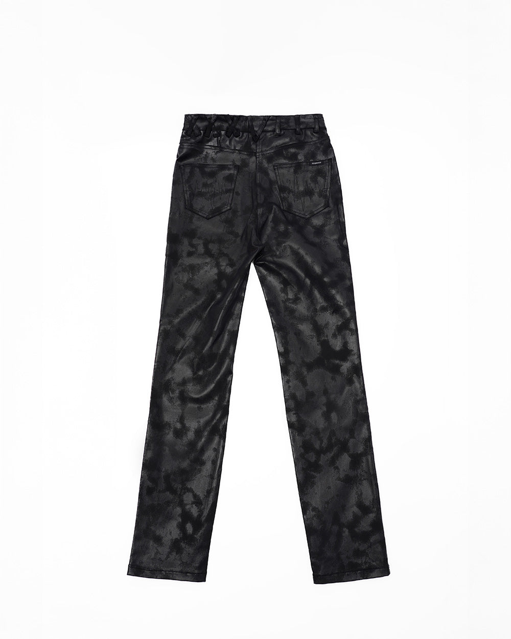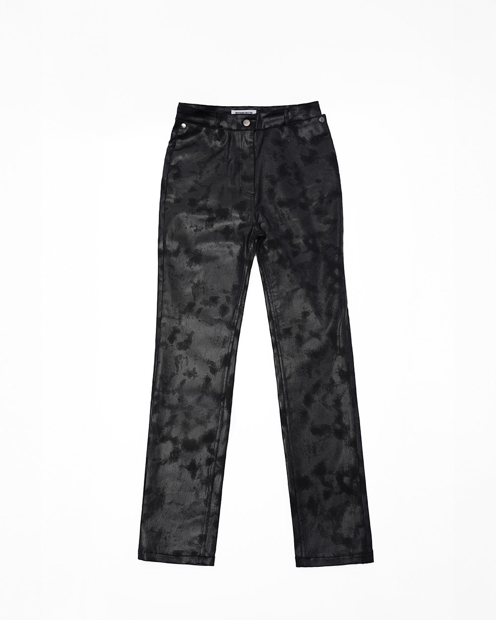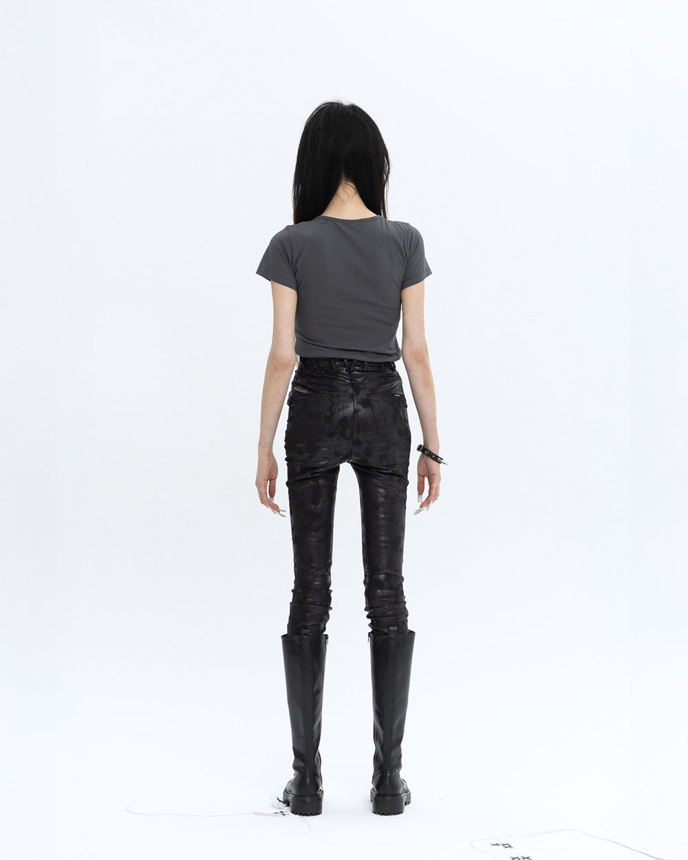 신축성이 뛰어난 코팅데님을 사용 하였고 가죽 처럼 보이는 코팅이 매력져서 블랙 코디에서 돋보이게 스타일링 할수 있는 스키니 팬츠 입니다.