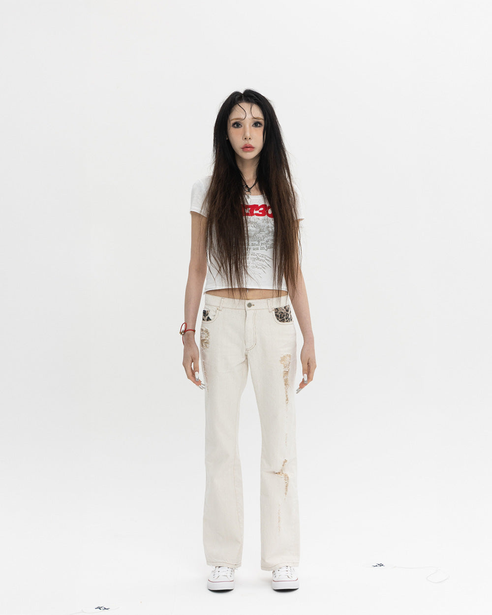 안쪽의 실색이 다른 재미있는 원단으로 그런지 한 느낌을 살려 디자인 한 핏 한 부츠컷 팬츠 입니다.