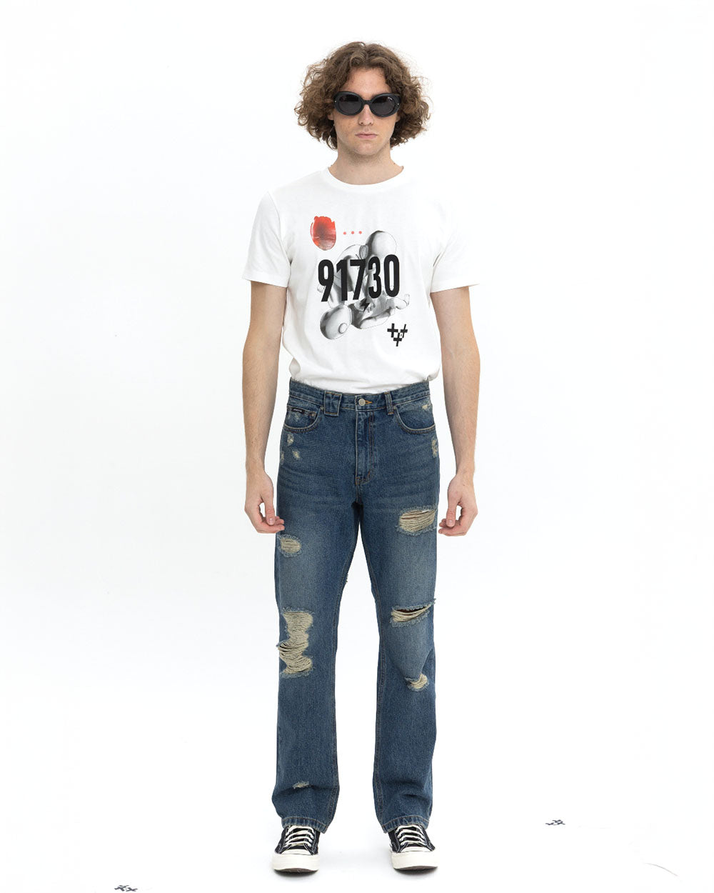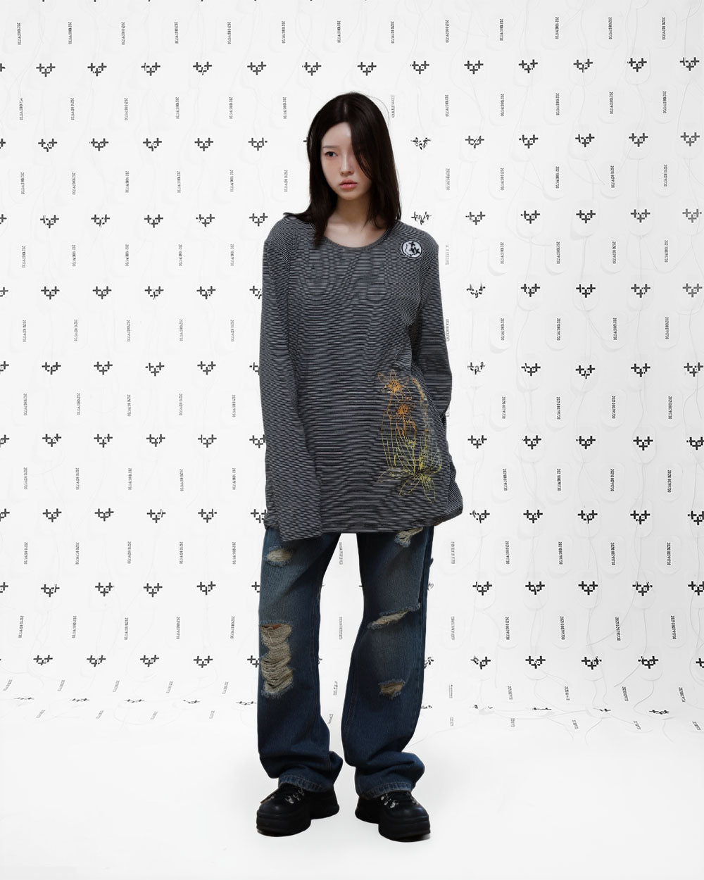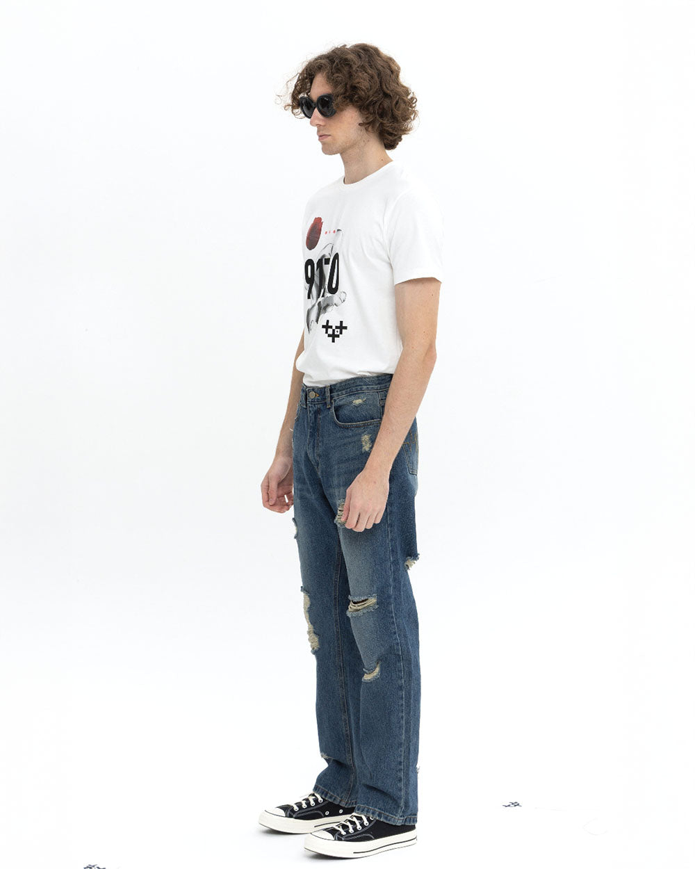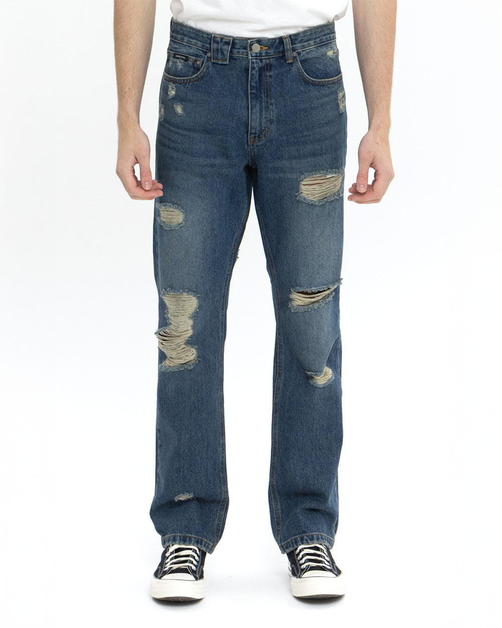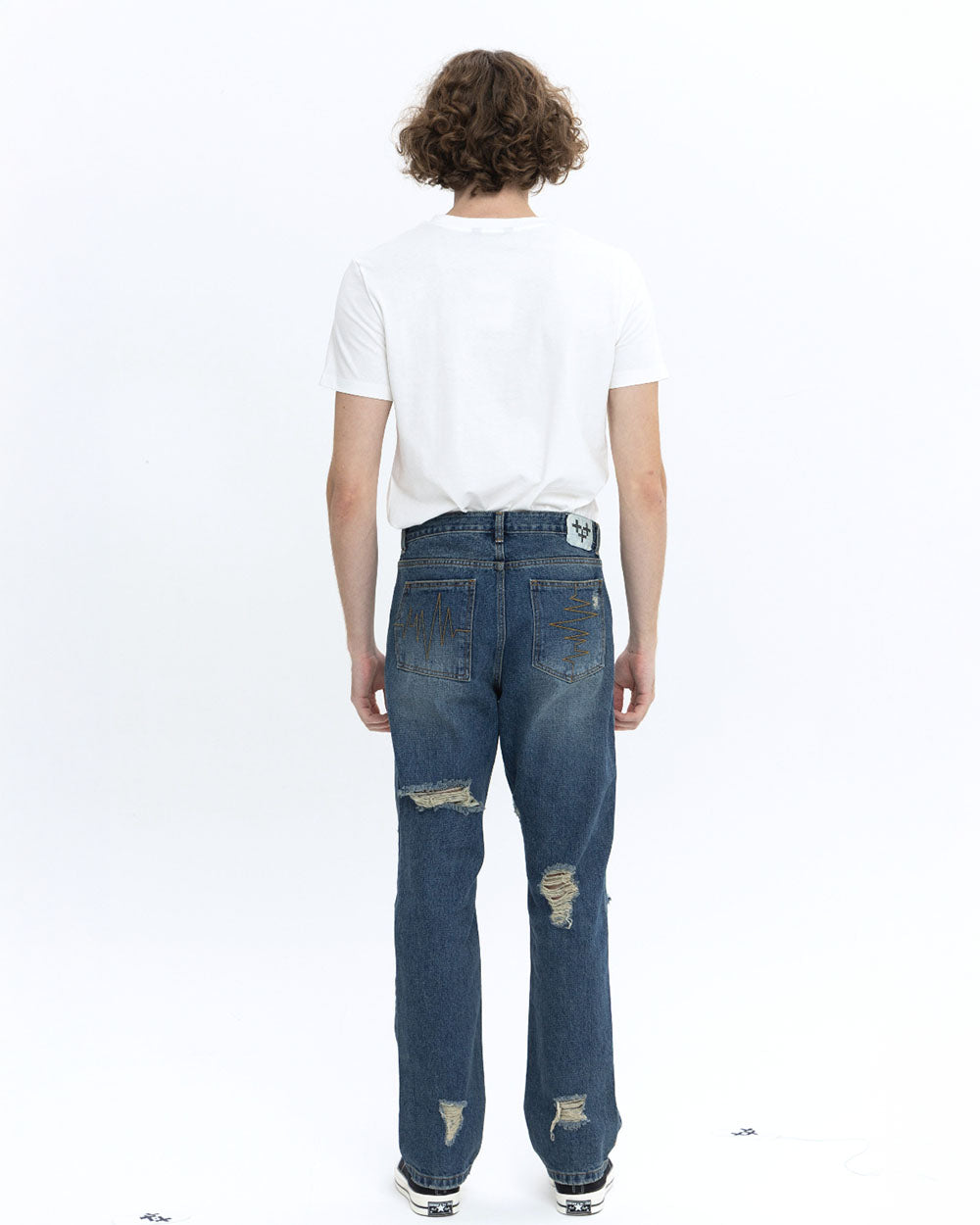 18개의 데미지 디테일이 있는 디스트로이드 데님 팬츠 입니다. 클래식 한 스트레이트 핏으로 디자인 하였습니다.