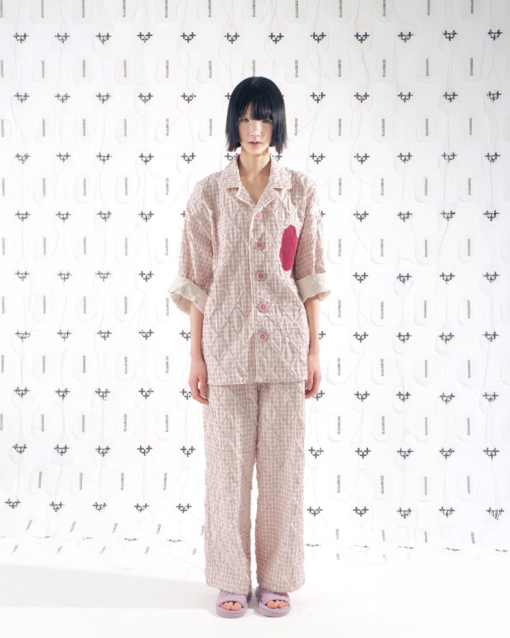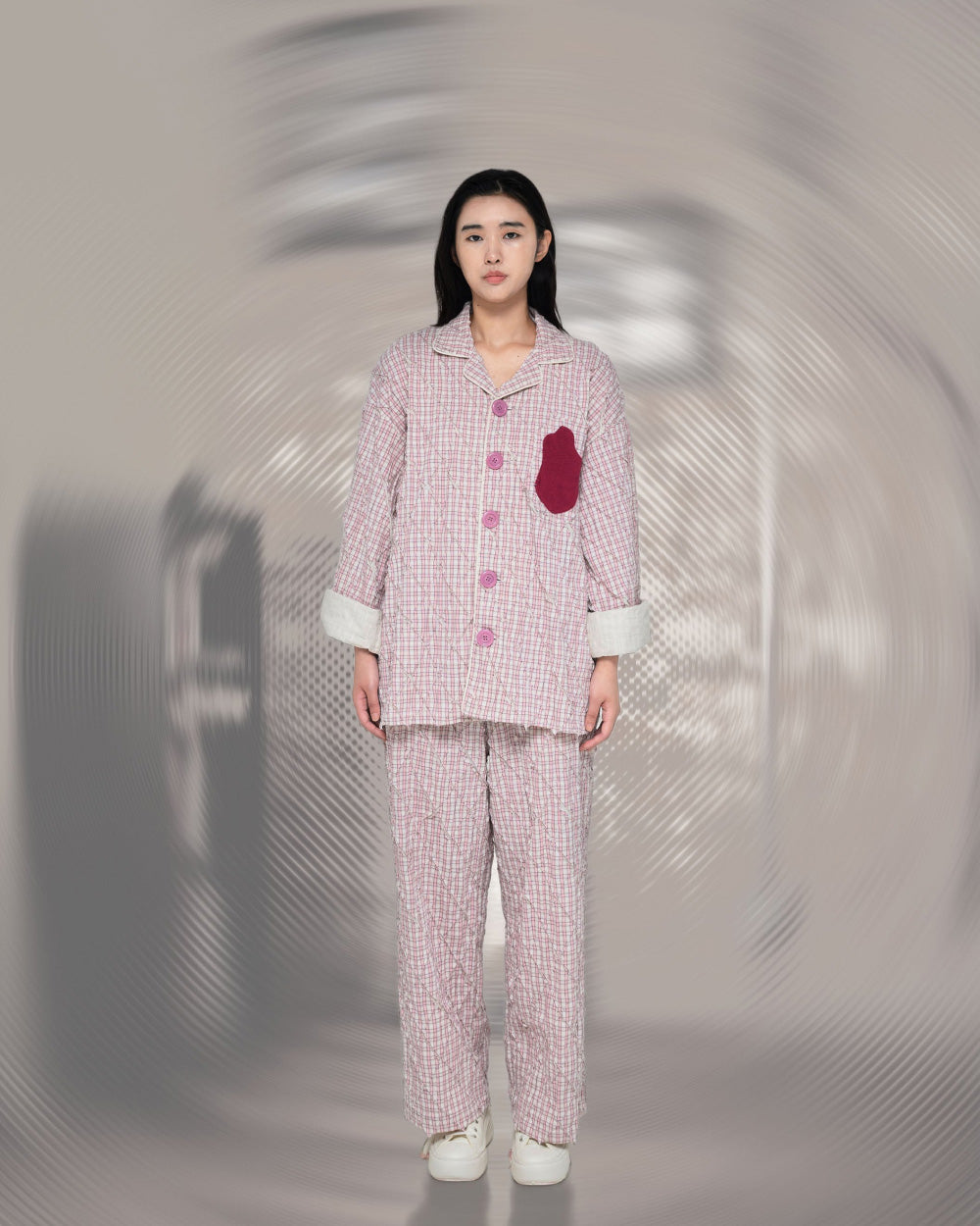 핑크 컬러의 키치 하고 유니크 한 원단이 임팩트가 있고 파자마 지만 자켓 처럼 제작 하였습니다.